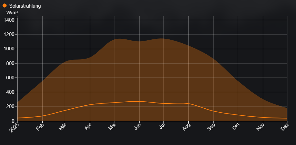 - d'Sonnestralung pro Mount (Duerchschnëtt, Maximum)